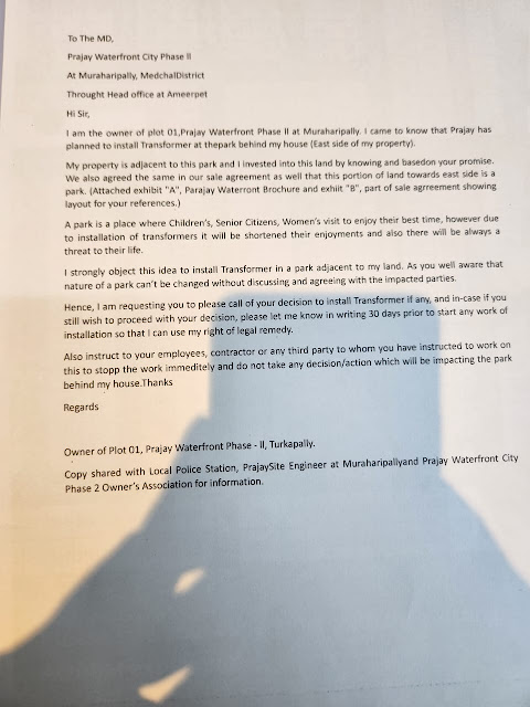 The Builder version is that the transformer location is per provision and in consultation with experts in electrical engineering. They also believe such a letter will start the hurdle to bringing transformer and electricity in the PRAJAY WATERFRONT CITY PHASE 02.